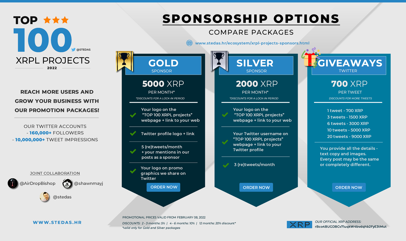 The "Top 100 XRPL projects" list is a collaboration project between @stedas, @AirDropBishop and @shawnmayj . We are credible and reputable members in the XRP community and our Twitter accounts have over 160,000+ followers with over 10,000,000 tweet impressions per month.