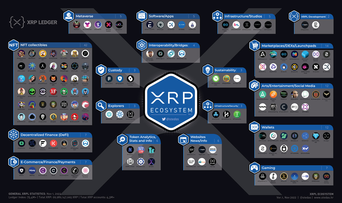 This poster shows diverse and vibrant XRPL Ecosystem including NFT Collectibles, Gaming & Metaverse, Marketplaces, DEXs & Launchpads,