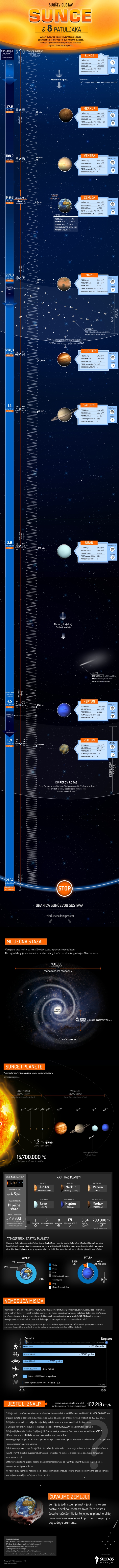 Sunčev sustav se nalazi unutar Mliječne staze - galaksije koja sadrži više od 200 milijardi zvijezda. Sunce i 8 planeta sunčevog sustava su nastali prije cca 4,6 milijardi godina. Infografika prikazuje cijeli Sunčev sustav te lokaciju planeta i njihove karakteristike.