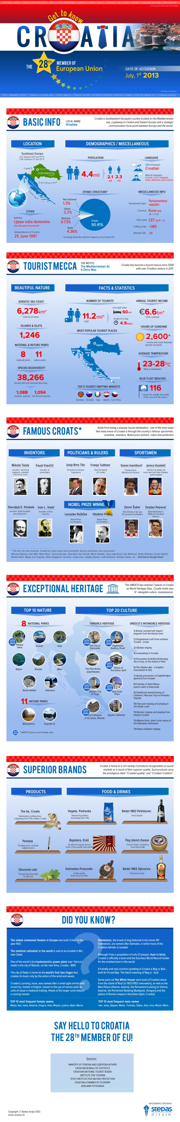 Croatia (local name: Hrvatska) is Southeastern European country located on the Mediterranean sea, a gateway to Central and Eastern Europe and a strategic communication focal point between Europe and the world. This infographic talks about its culture, nature, famous people and gives some basic facts and statistics. Also there are some interesting "Did you know" facts.
